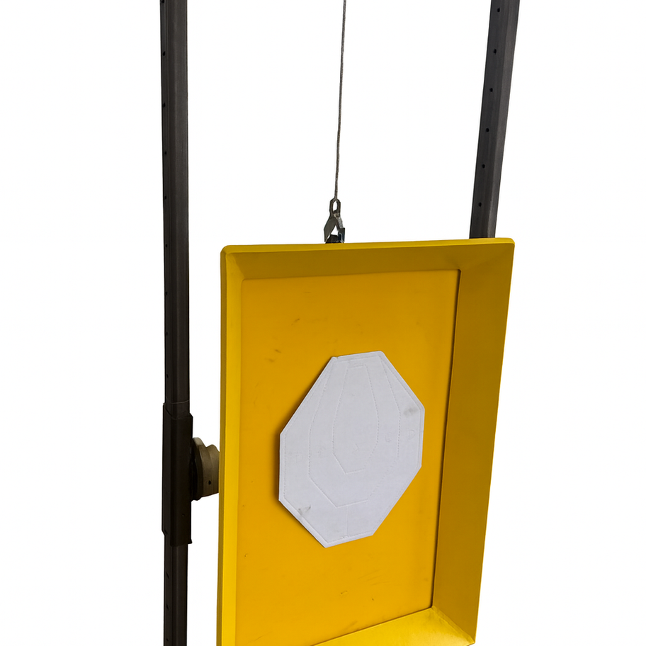 Approved up to .338, this mobile bullet trap can be operated by one man. In transport mode it fits in a regular van. Roll it to the targets area, assemble the frame and winch up the trap to the correct hight. The trap can be angled to face the shooter in cases of angle shooting.